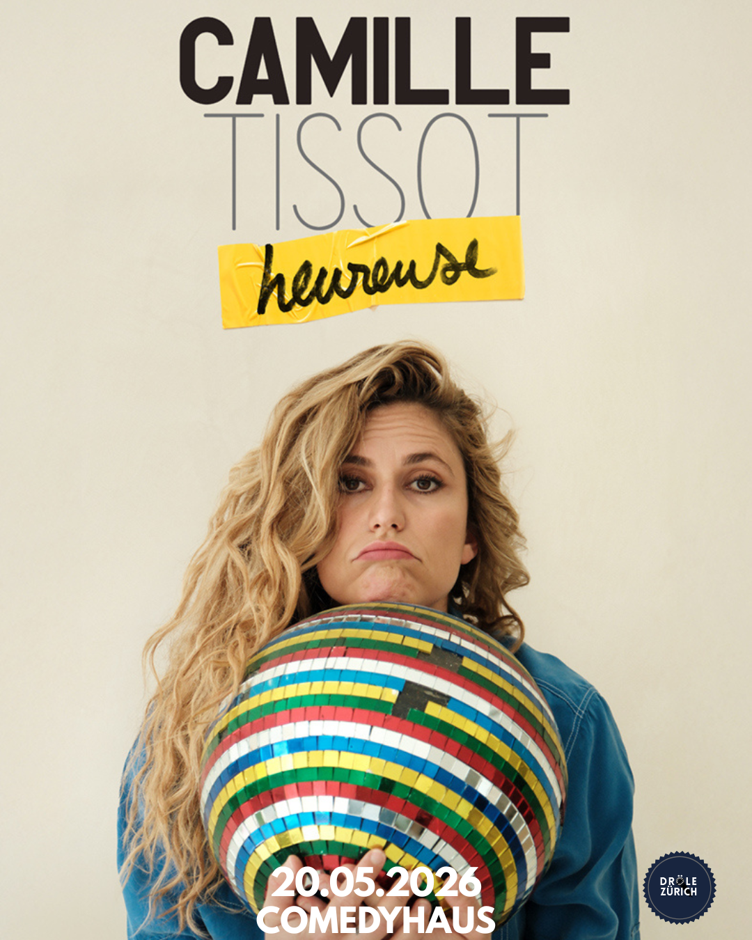 En accord avec Pow Pow Pow et TICPRODUCTION, Dröle Zürich présente Camille Tissot dans « Heureuse »Comédienne depuis dix ans, et ancienne chroniqueuse chez Canal plus, Camille lance son premier spectacle, Heureuse. Comme son état psychologique.